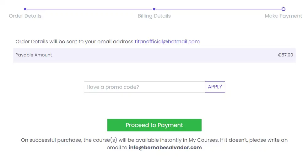 Paso 7: en este apartado podrás añadir un código promocional, aplicando un descuento al precio final. Después haremos click en el botón verde «Proceed to Payment»